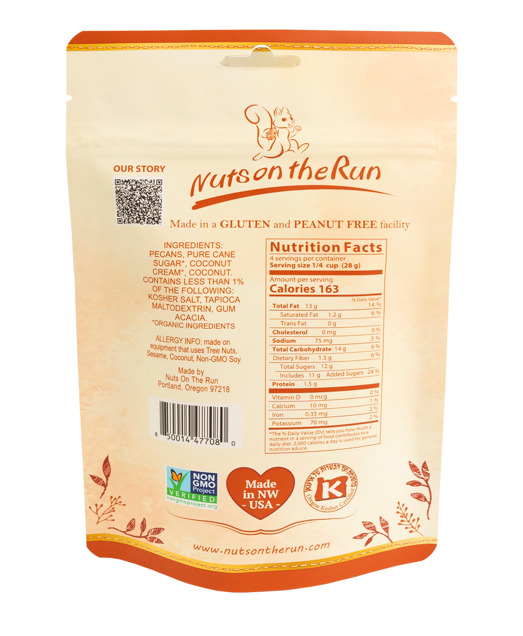 Nuts on the Run's Sea Salt Caramel pecan is a 2023 Good Food Award winner for taste, Texture and great ingredients! Made with a rich caramel blend that consists of organic coconut cream and organic cane sugar, pecans, and a dash of flaky sea salt. Roasted over low heat in small batches to ensure freshness and crafted with the utmost respect to quality ingredients, our nuts are as fresh and tasty as can be! Size: 4oz. PERFECTLY GLAZED PECANS: Freshly produced in the USA in small batches with organic caramel sauce guarantees freshness and an extraordinary taste. A PREMIUM CHOICE: Kosher certified, non-GMO, gluten-free, vegan, peanut-free, and dry-roasted with no artificial ingredients. ADVENTURE AND DISCOVER: If you have not yet tried Nuts on the Run's snacks and gifts, you're missing out but don't take our word for it. Read the raving reviews across our store, Facebook, and Amazon store.